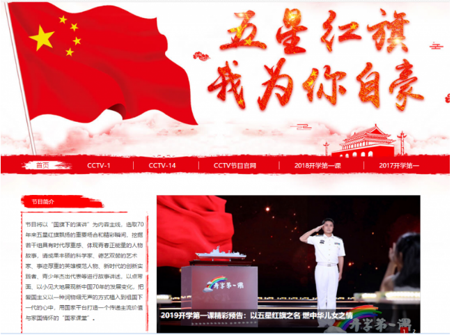 2019年《開學(xué)第一課》以“五星紅旗,我為你自豪”為主題,通過希望(因為你,我在黑暗中尋光)-----勇敢(甘當(dāng)人梯,只為你高高飄揚)---使命(“身披”五星紅旗護(hù)航深藍(lán))---未來(五星紅旗 有月球背面“閃耀”)-----愛國(五星紅旗,在祖國高高飄揚)這5個故事情節(jié)講述了中國夢!