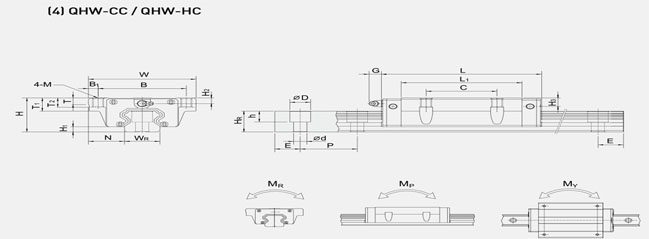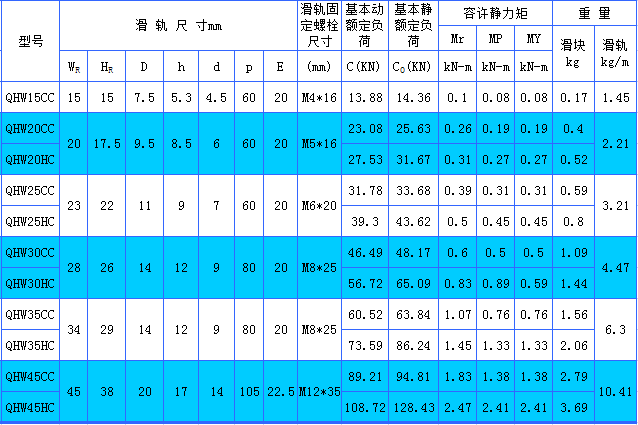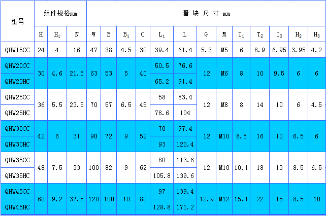 上銀直線導軌靜音型QHW-CC/HC系列安裝尺寸表: