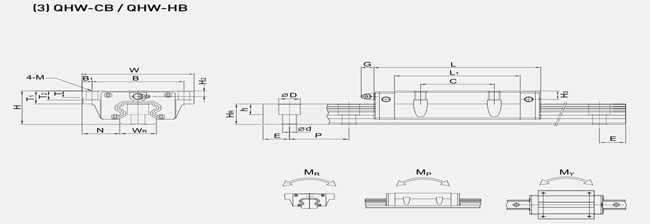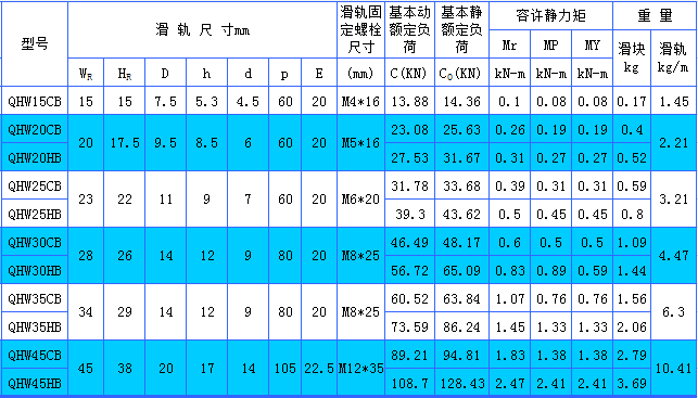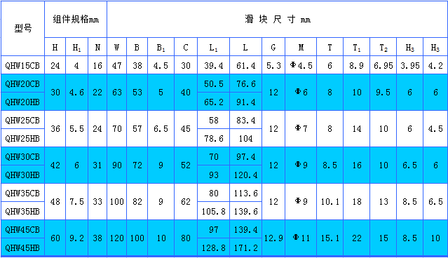 上銀直線導(dǎo)軌靜音型QHW-CB/HB系列安裝尺寸表: