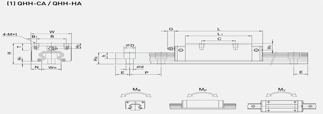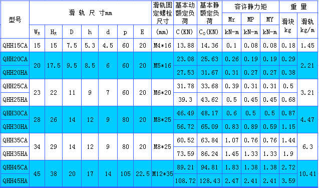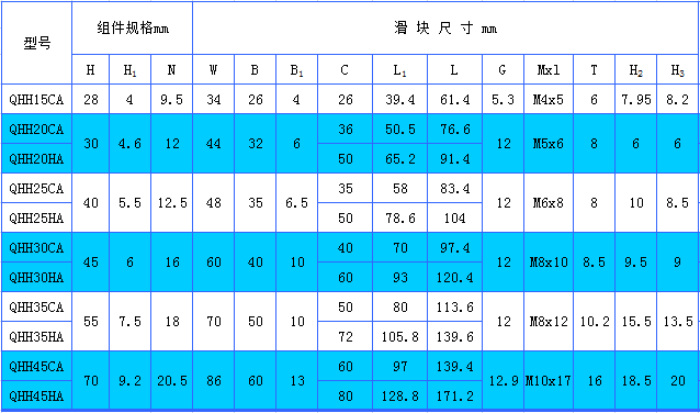 上銀直線導(dǎo)軌靜音型QHH-CA/HA系列安裝尺寸表: