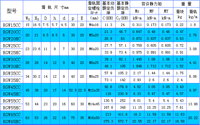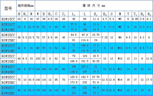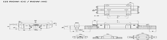 上銀滾柱型RGW-CC/HC 系列直線導軌安裝尺寸表