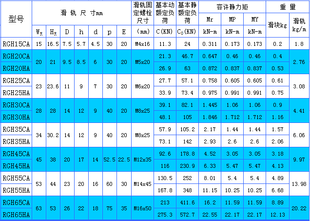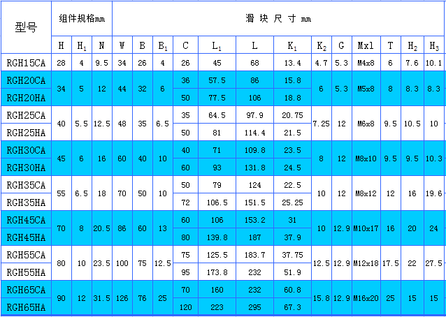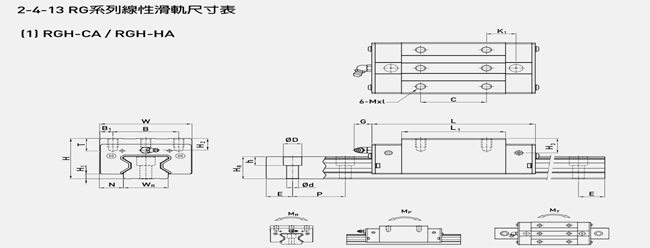 上銀滾柱型RGH-CA/HA系列線性滑軌尺寸表