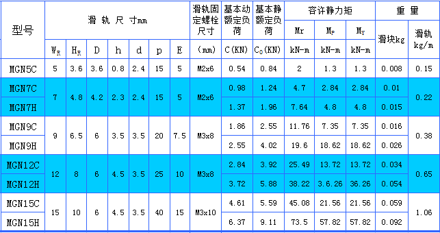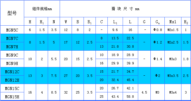 上銀微型滑軌 - MGN-C/H安裝尺寸表