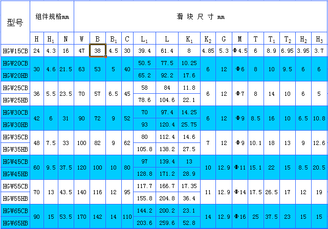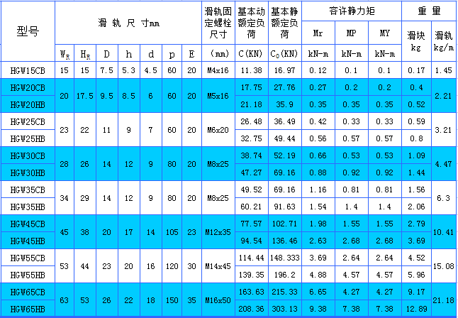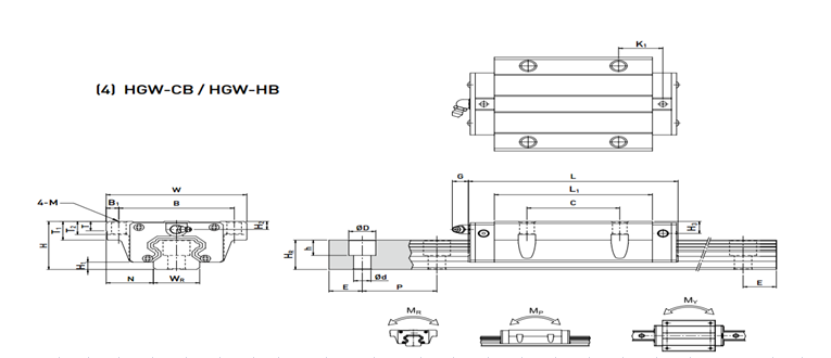 上銀直線導軌--HGW-CB/HB高組裝有法蘭尺寸表