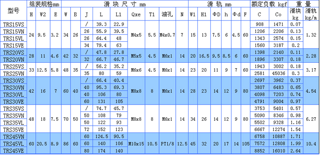 上圖為深圳TBI線性滑軌TRS低組裝無法蘭直線導(dǎo)軌安裝尺寸表。TRS-V低組裝四方型無法蘭系列滑軌常用于產(chǎn)業(yè)自動化機器、半導(dǎo)體機械、包裝機械、各種檢測設(shè)備、醫(yī)療設(shè)備……等各種精密機械。 溫馨提示:TRS低組裝系列滑軌除了有加長型“VE”滑塊外,另有二孔安裝“VS”系列,如需要此類規(guī)格的產(chǎn)品下單前請務(wù)必跟業(yè)務(wù)人員溝通確認清楚,以免造成損失。