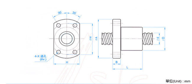 SFK型螺帽為滾珠絲桿中微型滾珠絲桿,此種螺帽法蘭為四孔安裝,循環(huán)原理同I型螺帽相同,單不同循環(huán)的時(shí)候,循環(huán)位置皆位于相同角度值鍵槽上面。