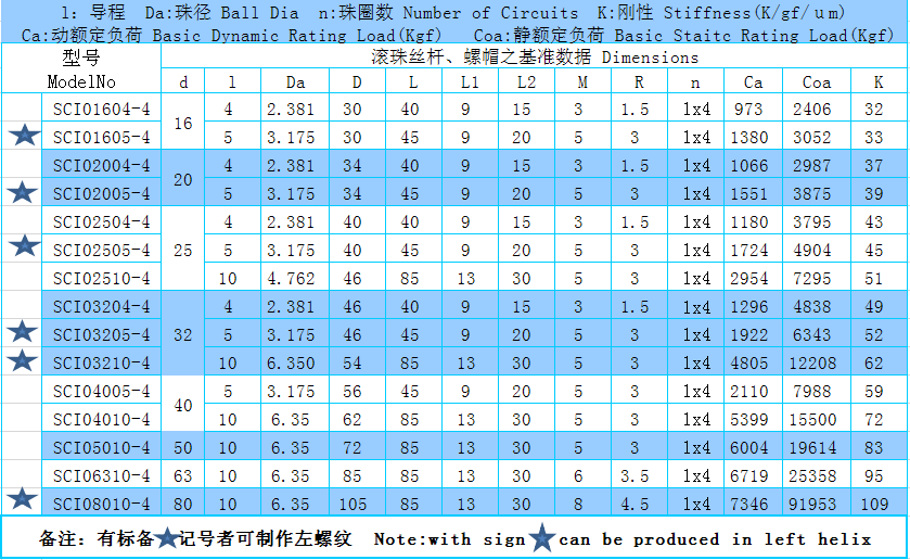 SCI無法蘭滾珠絲桿為TBI滾珠絲桿中的比較少用的一種型號,此種螺帽沒有法蘭安裝孔。(有星形標記的可定制左旋絲桿)
